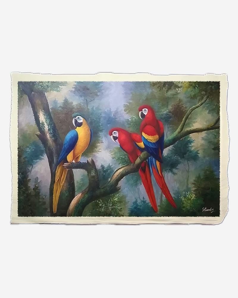 (60x90cm) Pintura óleo do pintor Stanly retratando as araras em plena floresta tropical.